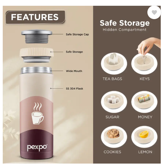 Pexpo Crypto ISI Certified Bottles are made for black coffee, green tea lovers as well as for daily office commute. Hidden compartment to carry medicines, tea bags, coffee etc. These Jars undergo rigorous testing for durability, corrosion resistance, and material composition to ensure top-notch quality. Designed for easy carrying by hand or in your backpack’s side compartments, this bottle is perfect for use at the office, gym, or while traveling. You can keep your drinks at the perfect temperature. The innovative design of these bottles includes two steel layers sandwiching a thicker aluminum sheet, which ensures that hot drinks stay hot and cold beverages stays cool. Made from high-grade stainless steel (304 Layers), this bottle is durable, non-corrosive, and resistant to rust, and bacteria. The wide-mouth design allows for easy filling, cleaning, and customization with ice cubes or fruit slices. Additionally, it is leak-proof and BPA-free, ensuring your safety. Apart from its practical benefits, the Pexpo flask also looks great. Modern design is eye-catching and will make you stand out from the crowd. The bottle is available in different colors to suit your style and preferences